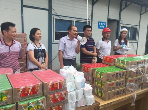 下午15点40分,送清凉活动在新翼广场项目有条不紊的组织下正式拉开序幕。香甜可口的西瓜、功效齐全的防暑药品、清热解毒的凉茶堆满整个派送台。工友们整齐排列队伍,一一从派送员手中接过慰问品,脸上堆满的笑容。“感谢北滘镇总工会、公司工会此次送清凉活动。我们感觉很窝心也很开心”领到慰问品的工友们开心的告诉记者。
