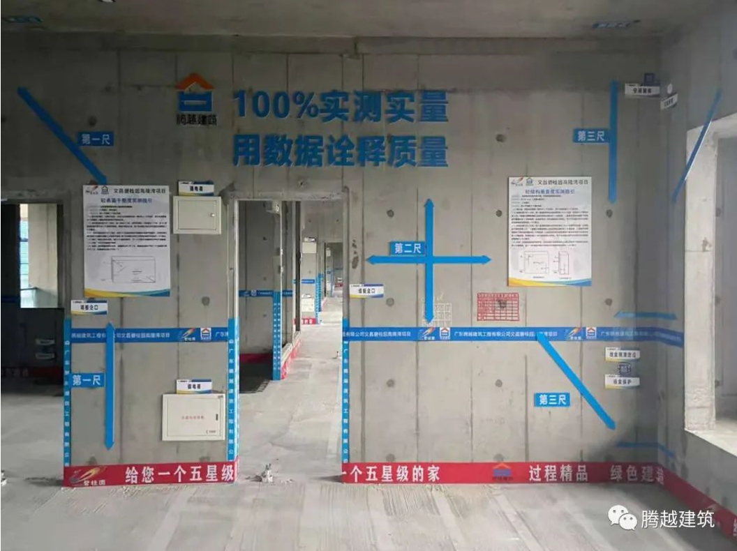 在大面积施工前,为保证成型效果,项目优先组织施工结构样板间,专人跟踪实测实量以及技术交底工作。验收无误后,方可进行大面积铺排,让施工人员对质量验收标准心中有数,有效促进施工质量的整体提升。