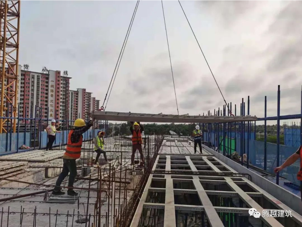 由于文昌高隆湾项目是海南公司首个装配式应用工程,在项目建造前期,面对技术方面的空白,项目团队查阅、借鉴其他众多装配式优秀工程案例,多次召开碰头讨论会,结合项目现场所需,化为己用,努力克服材料资源短缺、劳动力不足等困难,于2021年3月4日成功吊装第一块预制叠合板,代表着项目的阶段性胜利。