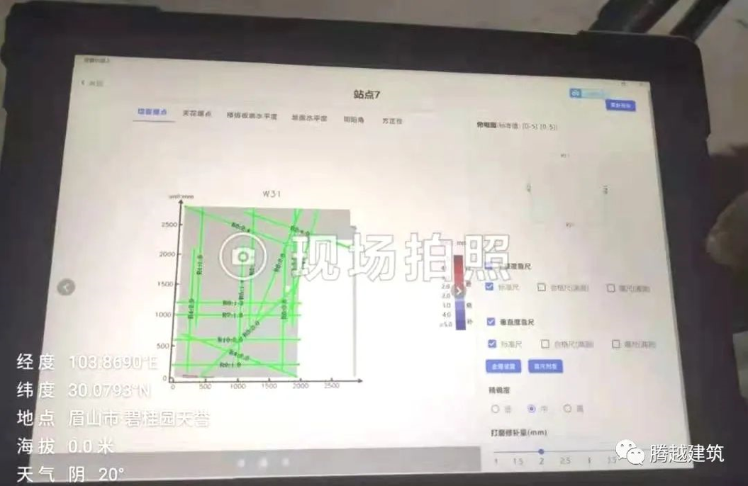 此外,在集团及公司的大力号召与积极推广下,四川眉山项目还在可支混凝土结构阶段、抹灰阶段、土建精装移交等环节,所使用的建筑机器人采用先进的AI测量算法处理技术,进行墙面平整度、垂直度、方正性、阴阳角、天花水平度、地面水平度等多个测量项测量,全面提高效率的同时,大大提升项目实测实量准确性。
