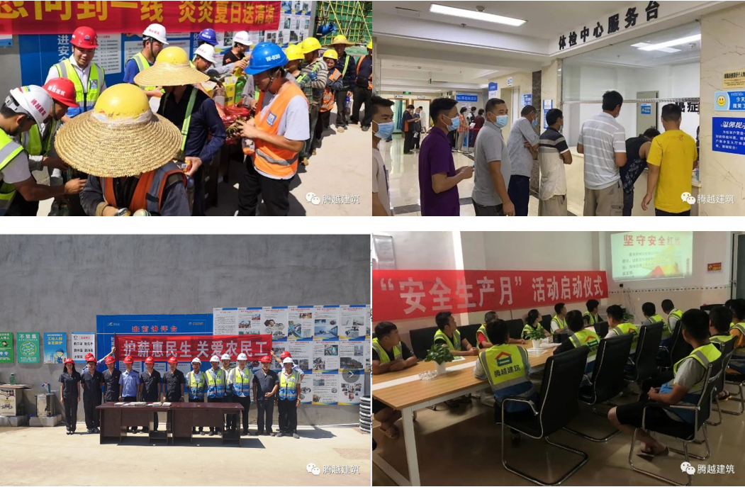 琼海项目团结广大工友,积极开展工友关怀行动,不定期组织农民工体检,送清凉、安全教育、学习法律知识等活动,截止目前,共组织149名劳务人员开展体检活动,开展送清凉活动4场,送安全教育、法律知识进现场活动4场,全面保障工友各项合法权益的同时,拉进与工人之间的距离,为广大工友打造一个健康、友爱的工作环境。
