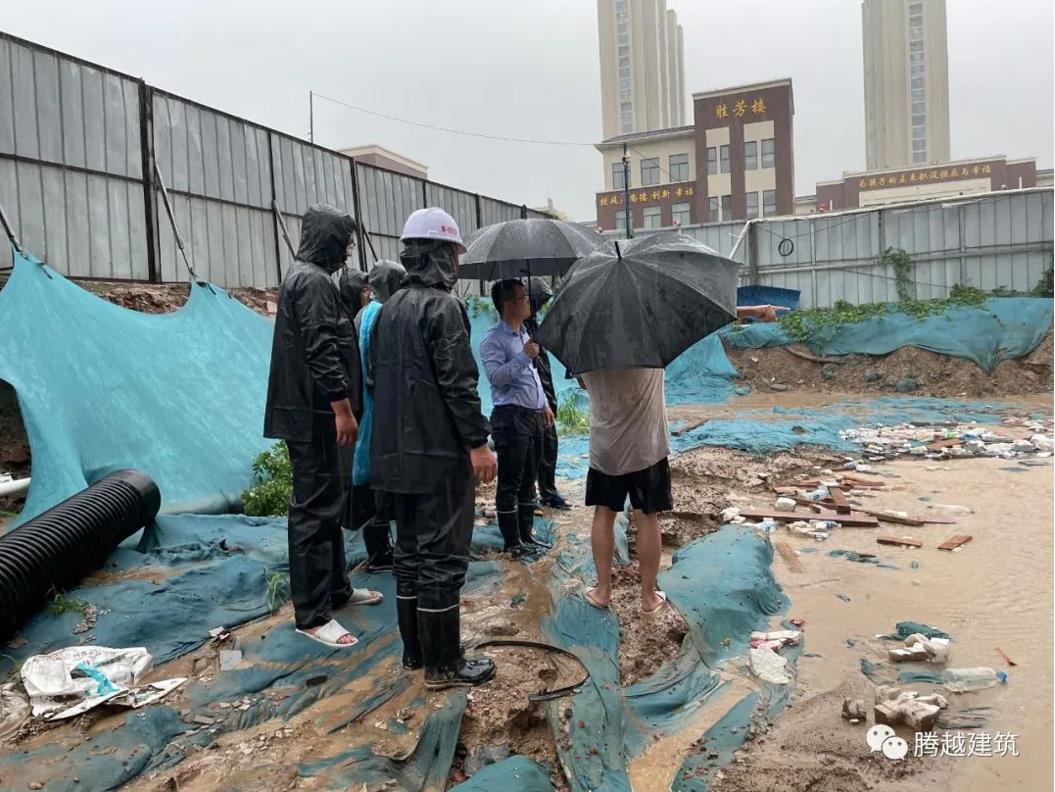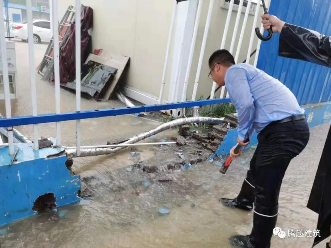 “危机还没有过去!”由于暴雨导致手机信号一度中断,刚恢复一点信号后,朱江峰从新闻中得知了这场雨到底有多“残酷”。他赶紧向全体管理人员布置抢险工作,由自己担任总指挥,各部门负责人分工协作。生产、技术、设备、安全等部门员工分成小组,分地块、分楼栋排查现场是否存在安全隐患,及时做好应急处理。材料负责水泵、沙袋、雨衣、手电筒等应急物资的准备,综合做好后勤保障。朱江峰说:“我们要保证自身生命安全,不要单打独斗,相信团队的力量能战胜一切”。