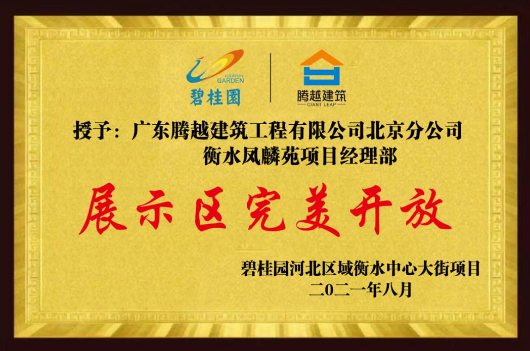 项目坐落于衡水市桃城区裕华西路南侧,总建筑面积11万㎡,展示区建筑面积1823㎡。项目不仅取得了联合验收94.2分的优异的成绩,更获得了碧桂园河北区域授予的“完美开放”奖牌以及最佳配合单位锦旗!
