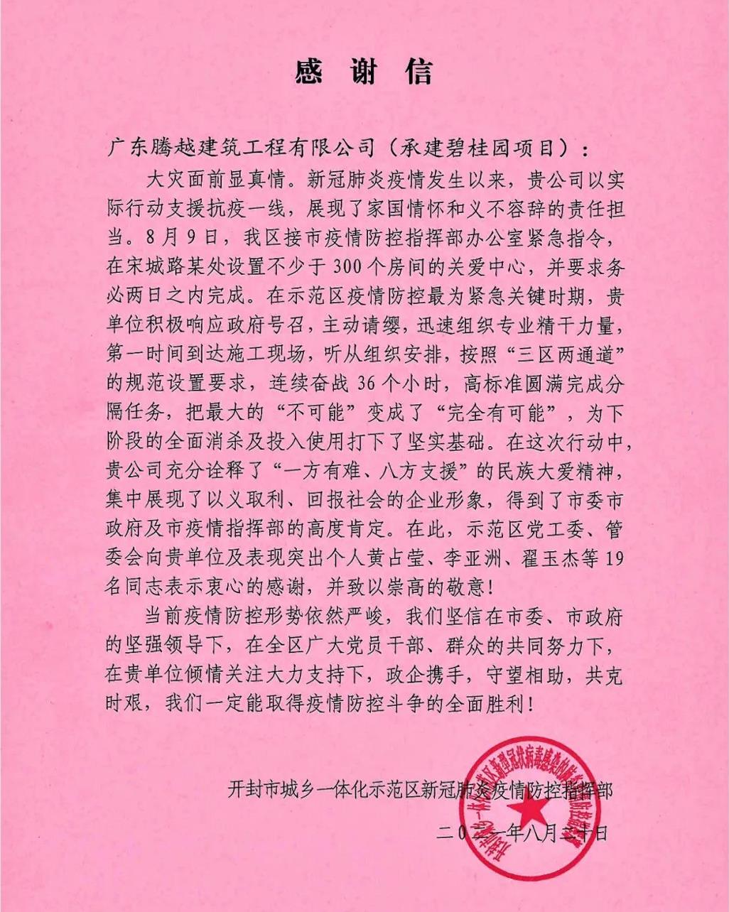 河南公司开封天玺项目收到开封城乡一体化示范区住建局新冠肺炎疫情防控指挥部感谢信