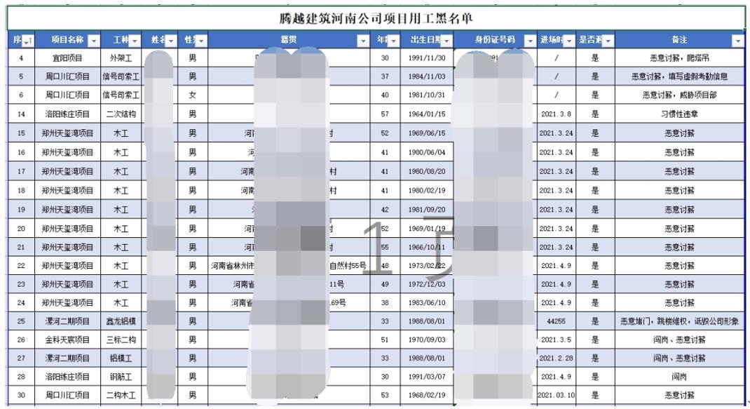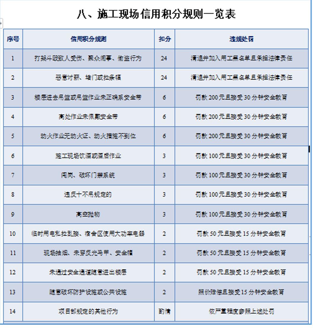 项目严格执行公司安全管理条例及河南公司安全管控考核管理制度,同时建立云端数据库2021年河南公司信用体系,类比道路交通管理,将习惯性违章、聚众斗殴、恶意讨薪等工人拉入黑名单,再将用工信息及黑名单作业人员信息共享,严禁黑名单作业工人进入河南公司在建项目,确保用工安全。