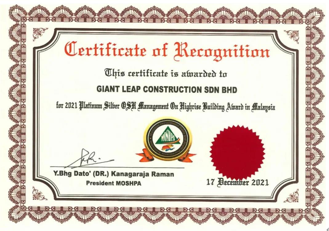 乐森世纪项目荣膺马来西亚国家职业安全与健康协会(MOSHPA)颁发“高层建筑建设类建筑健康安全管理铂金银奖”,成为马来西亚柔佛州首个摘得该奖项的项目。