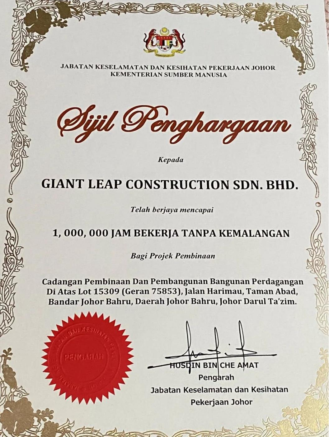 乐森世纪项目获柔佛州职业安全与卫生局(JKKP)颁发“100万工时零安全事故”奖状,谱写800多天以来的零安全事故纪录!