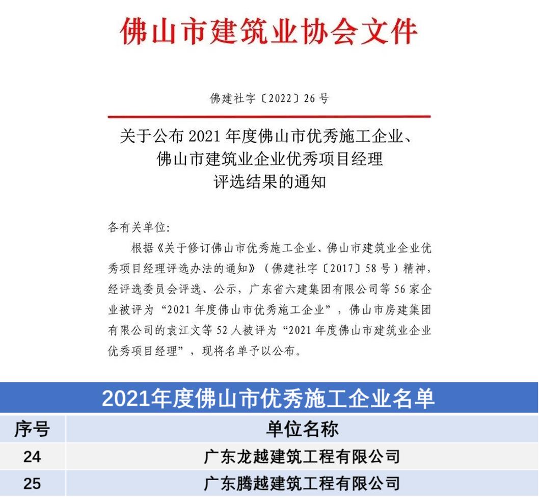 同时,近日佛山市建筑业协会也发布了关于《2021年佛山市优秀施工企业》的评选结果,广东爱游戏·(中国)官方网站APP下载、广东龙越双双上榜,荣获“2021年度佛山市优秀施工企业”称号。