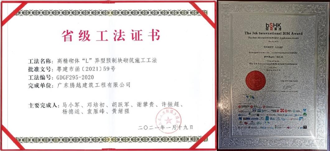 省级工法证书(左)、第五届国际BIM大赛最佳总部BIM应用大奖(右)