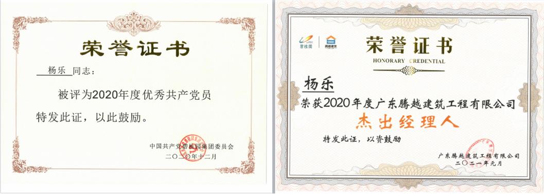 在他的积极策划下,佛肇公司广泛邀请外部单位专家调研交流,组织质安观摩60余次,带来外拓项目23个,荣获政府省市级“安全文明示范工地”、扬尘管控“标杆工地”、优秀“施工企业”、实名制管控“标杆工地”“红旗工地”等荣誉150余项,杨乐个人也获得“佛山市红旗工地评审专家”、碧桂园集团“2020优秀共产党员”“2020年度杰出经理人”称号。