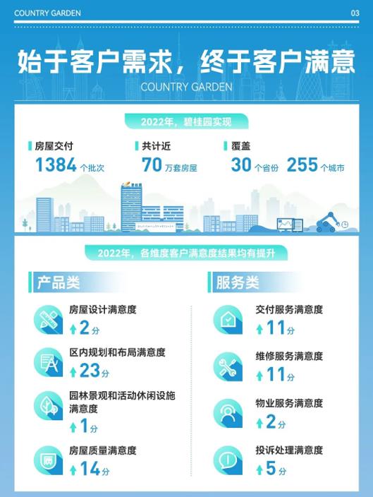 2020年以来,碧桂园连续多年实施“强基行动”,开展工程师文化季活动,全面提升基础产品力。根据最新发布的碧桂园ESG报告,2022 年,碧桂园在产品质量方面获得广厦奖项目 7个,中国建筑工程装饰奖项目1个,省级质量奖项 142 个,市级质量奖项97个。产品、服务类的客户满意度结果均有提升。